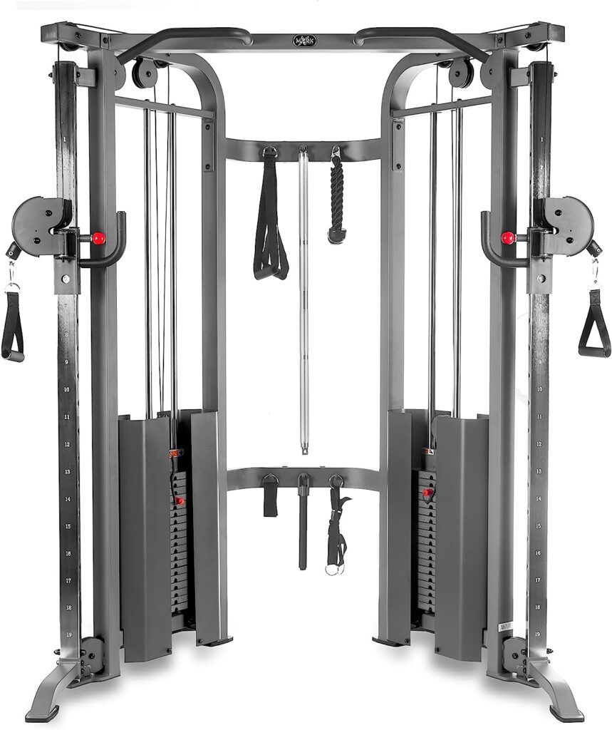 The XMark Functional Trainer Cable Machine is a top-rated choice for individuals seeking a compact and versatile cable machine. It features dual 200-pound weight stacks, providing ample resistance for a variety of exercises. The machine offers multiple pulley positions, allowing for customizable workout routines. The XMark Functional Trainer includes ergonomic handles and accessories, such as a tricep rope, single grip handles, and a long bar. The compact design makes it suitable for smaller spaces. With its smooth operation and versatility, this cable machine is highly regarded by fitness enthusiasts.